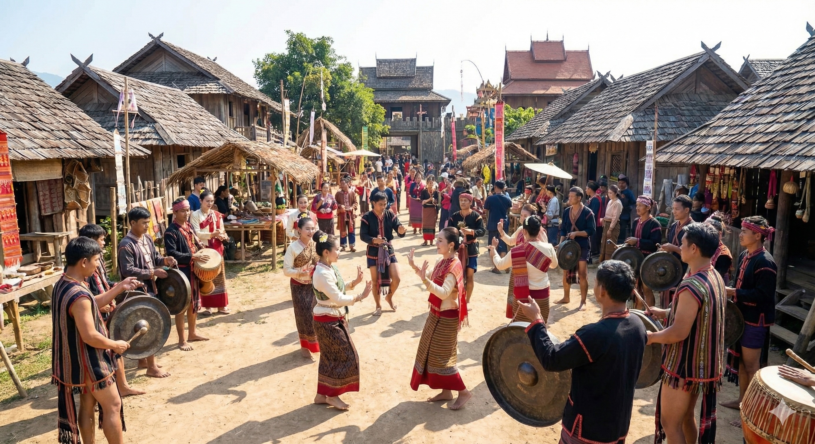 เสียงฆ้องกลองของงานประจำปีดังสะท้อนกลางเวียง