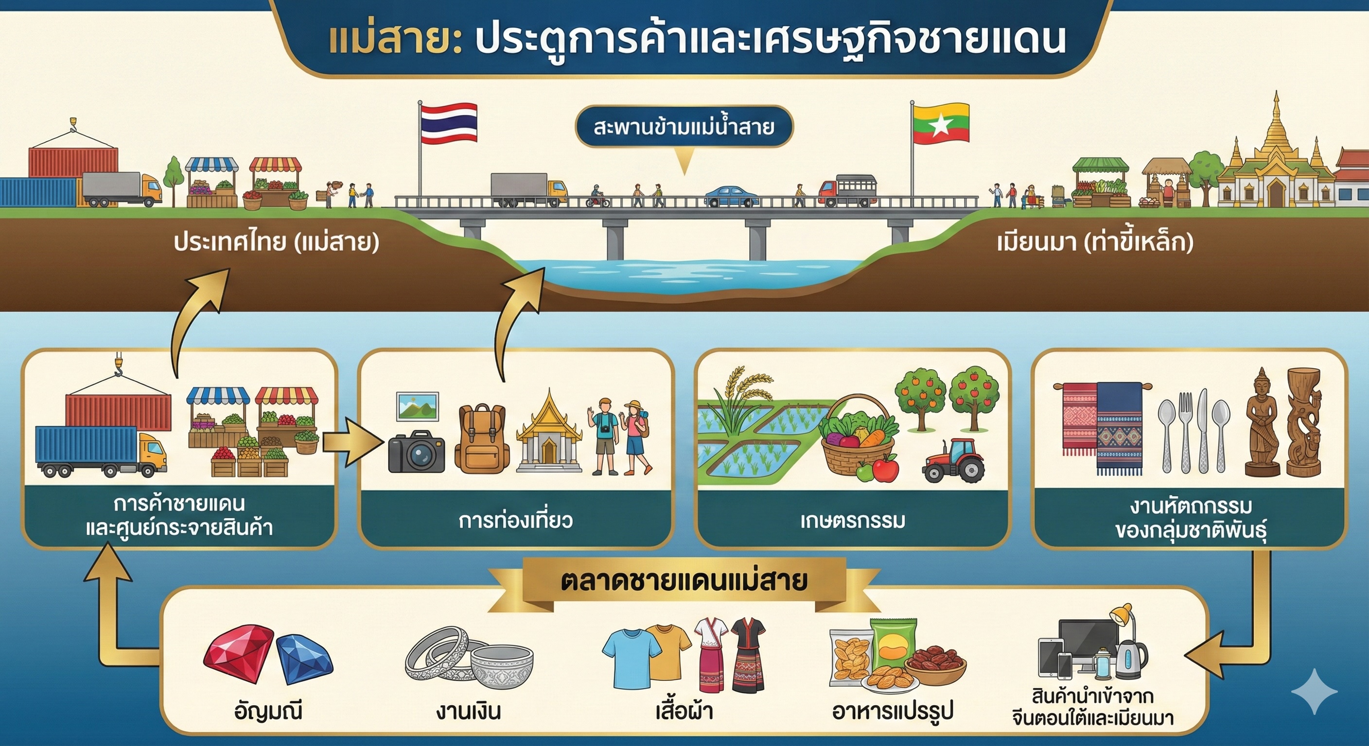 ตลาดชายแดนแม่สายเป็นจุดดึงดูดสำคัญ สินค้าที่พบได้ ได้แก่ อัญมณี งานเงิน เสื้อผ้า อาหารแปรรูป และสินค้านำเข้าจากจีนตอนใต้และเมียนมา