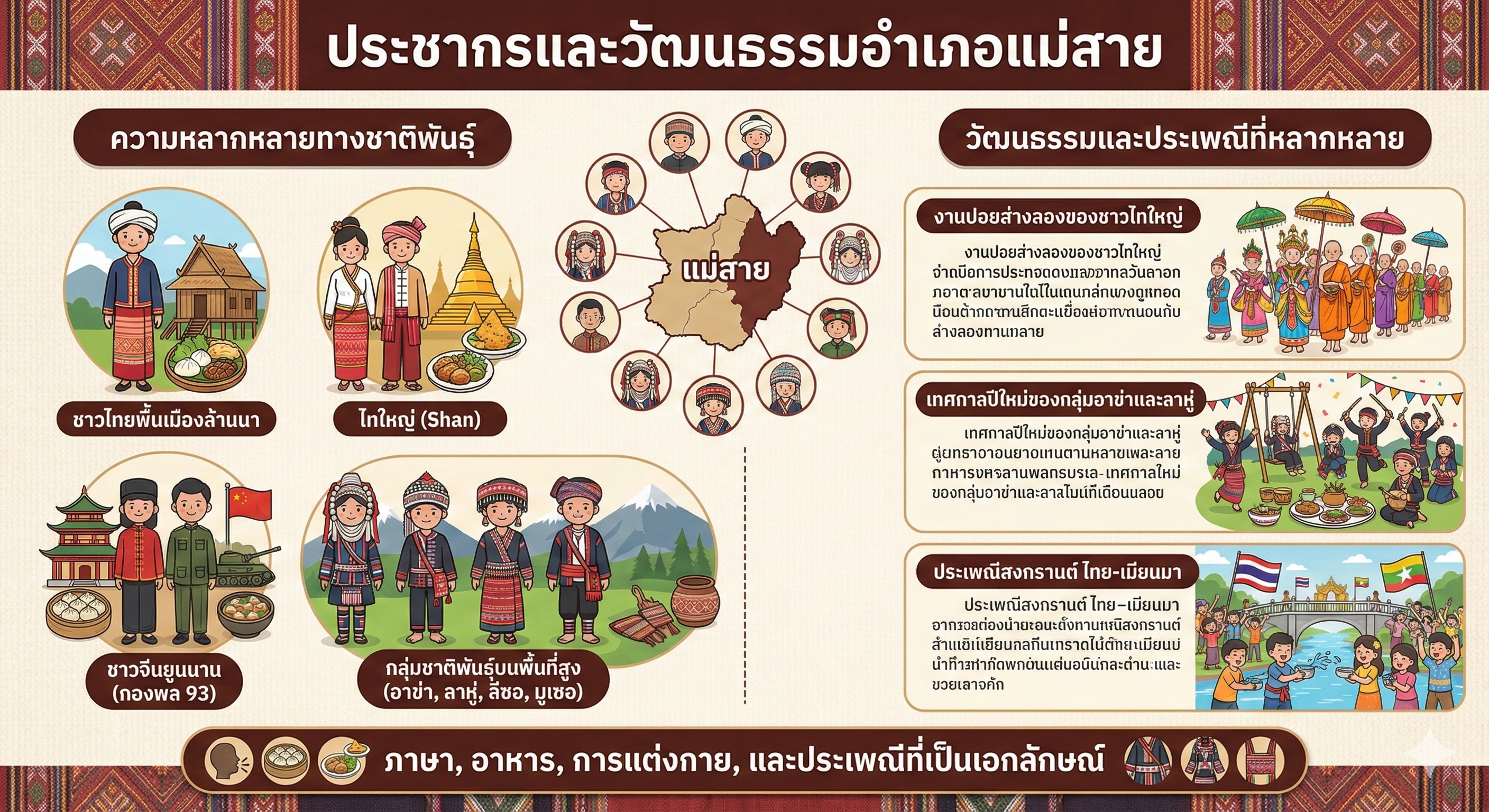 ความหลากหลายนี้ทำให้แม่สายเต็มไปด้วยวัฒนธรรมที่หลากหลาย ทั้งภาษา อาหาร การแต่งกาย และประเพณี เช่น